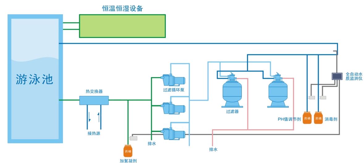 游泳池水質處理系統遵從動態平衡工作原理,在循環處理過程中達到水質的徹底凈化。