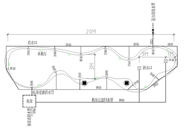 系統(tǒng)二:補(bǔ)水系統(tǒng)。采用由市政管網(wǎng)直接補(bǔ)水,在泳池邊設(shè)進(jìn)水口,按初次注水不超過(guò)48小時(shí)計(jì),管徑為DN25,與別墅總管相同,水池水量90m³。每日補(bǔ)水量取總水量3%,計(jì)2.7m³,在每日清潔吸污后補(bǔ)充,或每3-7日投加混凝劑沉淀吸污后補(bǔ)充。