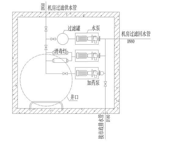 該方案泳池水循環(huán)一般采用順流式循環(huán),回水口設(shè)在池底,在池壁水面下0.5-1.0米處均勻布置出水口。保證水流分布均勻,無(wú)短流、渦流及死水域,循環(huán)周期8-10H,循環(huán)次數(shù)3-2.4。泳池消毒采用紫外線消毒,循環(huán)水經(jīng)過(guò)消毒后進(jìn)入泳池。過(guò)濾采用高速濾罐,僅在需要時(shí)才開(kāi)啟過(guò)濾泵,水質(zhì)達(dá)標(biāo)時(shí)不開(kāi)啟。采用計(jì)量加藥泵投加混凝劑,定量加入管網(wǎng)后從給水口加入泳池。
