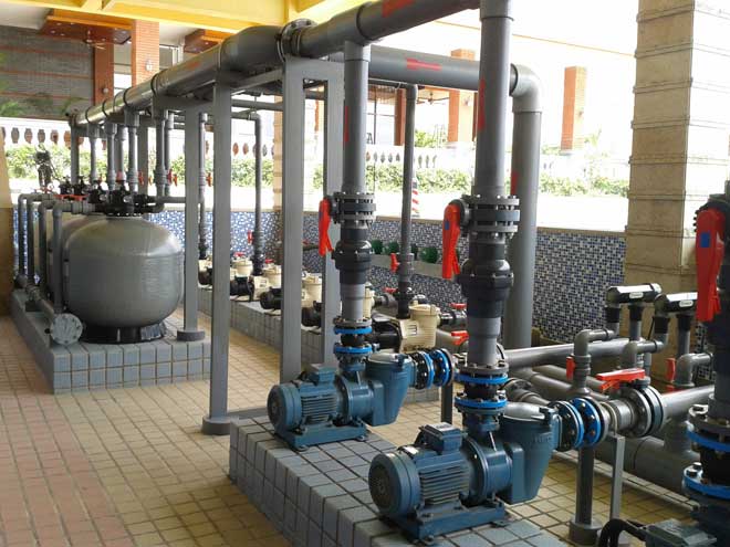 游泳池循環水凈化處理設備機房,一般由均衡水池(或平衡水池)、循環水泵、過濾器、加藥設施、換熱器、消毒設備、化學藥品和助凝劑、特殊設施、系統運行操作控制設備等內容組成。但它會因其游泳池的規模、循環游泳池水凈化設備及流程的不同而有所變化。