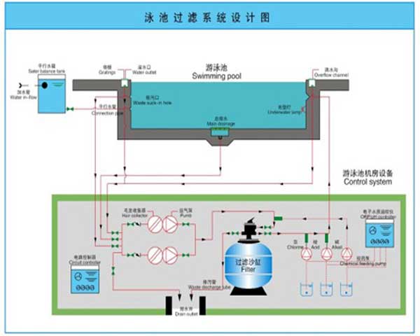 泳池水過濾凈化工藝包括:“降低池水的渾濁度、提高池水的透明度、去除池水中膠狀或顆粒狀有機物、細菌和病毒”。保證游泳者的安全、衛生,對池水進行過濾是不可缺少的。