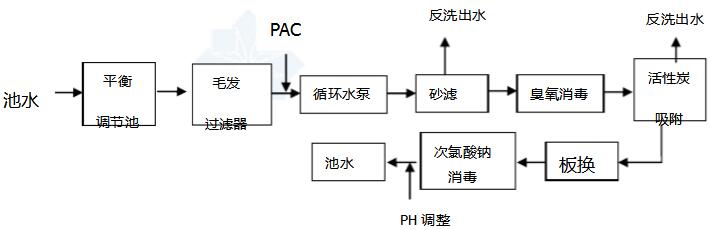 將水中毛發(fā)、大的懸浮物截留住,以免毛發(fā)纏繞泵的葉輪,影響后繼設備運行;出水加入混凝劑后,在管道內發(fā)生混合反應,將水中微小懸浮物凝聚,產生礬花經高速過濾器后經石英砂過濾器截留;后經過臭氧消毒,后的水通過活性炭吸附去除水中剩余的臭氧,經過換熱器,使水溫達到相應要求;此時加入消毒劑,以殺滅水中細菌,保持一定的余氯量,然后池水重新回到泳池。