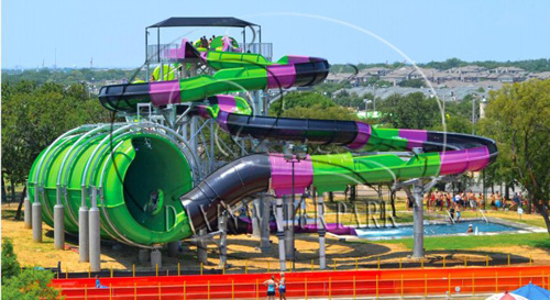巨蟒滑梯:游客乘著最多一次可以容納6個人的圓形皮筏浮墊從19米的高空出發,高速穿越一段六十多米的螺旋滑槽后,急速下降近十米俯沖至一條巨大封閉管道中,反復左沖右突和旋轉著,猶如身處憤怒的蟒蛇當中,努力去黑暗作斗爭,最終重見光明,回歸平靜的水中。帶給游客一種獨特的奮進的漂流體驗。由于體積龐大,形狀獨特壯觀可以作為大型水上樂園王牌賣點,標志性設施。另外此水滑梯接待能力非常強每小時最大接客量高達1080人,最大程度地縮短游客排隊時間,極大的吸引人氣。