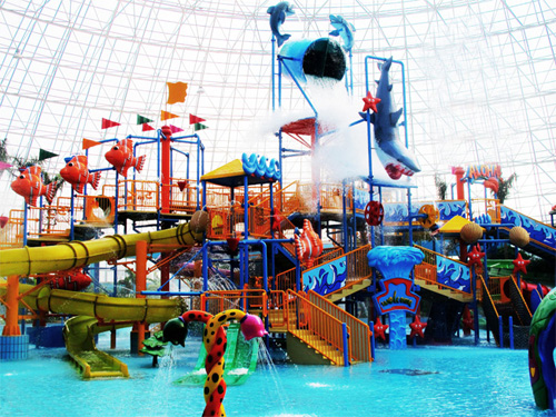 • 此水上樂園設備以神奇的海洋生物為主題風格,一個大翻桶正居中央,多條滑梯如各通道盤繞在周邊。占地面積約1700平方米。